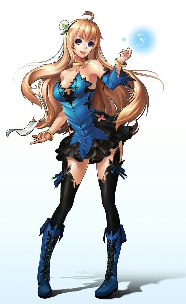 Faye is a little shorter than average with a medium solid build. Long wavy blonde hair is pulled back to reveal a warm inviting face that reflects her optimistic nature; her glistening dark blue eyes glance protectively over the guild members she regards as family. Flushed light-olive skin compliments her eyes and hair, and her elegant brightly colored clothing leaves an amusing question about the difficulty of her previous adventures.